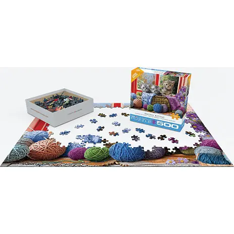 Det puslespil illustrerer tre killinger, som har fundet deres yndlingssted i kurven med garn. De spekulerer på, hvilken strikketrøje der passer bedst til dem.