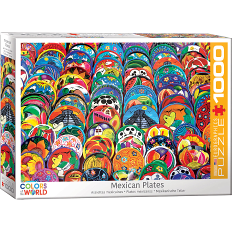 Dette puslespil illustrerer en farverig samling af mexicanske keramik-tallerkener, også kendt som Talavery keramik, der er et lyst og farverigt porcelæn. De viser nogle af de fineste detaljer, der er brugt i Talavera kunst.