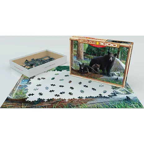 Dette puslespil illustrerer et billede af en bjørn der ledsager sine to unger sikkert gennem skoven, på vej mod nye opdagelser.