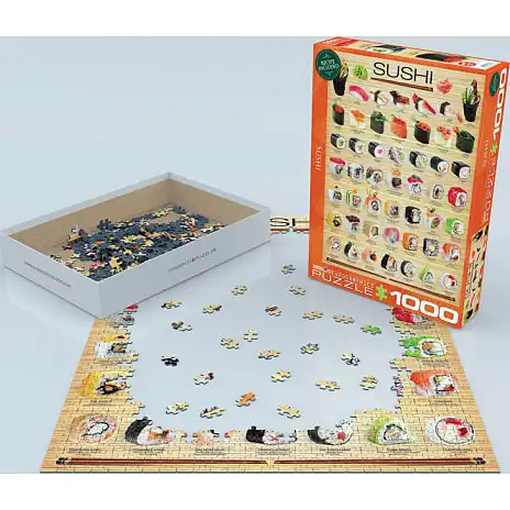 Dette puslespil illustrerer en oversigt over alle de former for sushi der eksistere med navns nævnelse under hver enkelt.