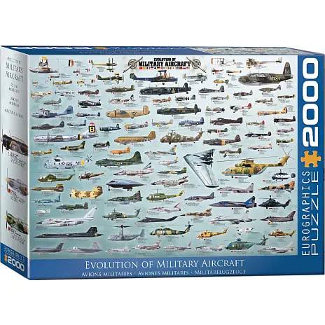 Dette puslespil illustrerer en samling af forskellige militære luftfartøjer, hvor der er tilhørende information om fartøjerne og hvilket land der har benyttet sig af dem.