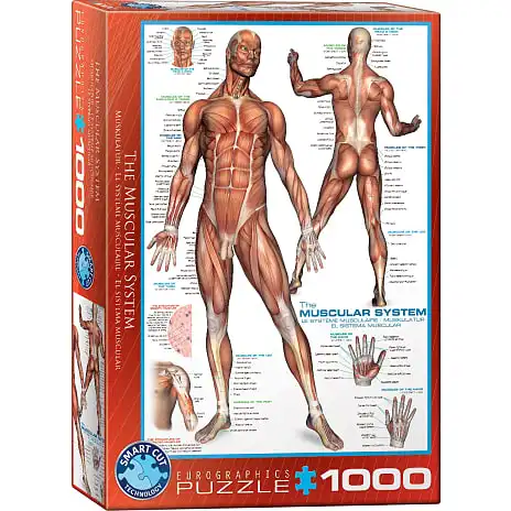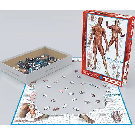 Dette puslespil illustrerer en billede af menneskekroppen og dens muskler, og indeholder yderligere information omkring hoved, skuldre og hænder.