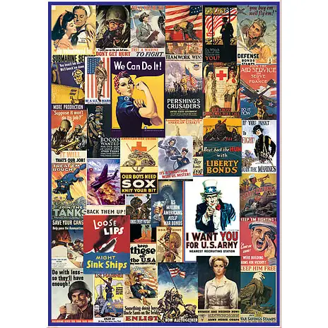 Dette puslespil illustrerer en collage af antikke plakater, som hylder det amerikanske folk og de soldater som kæmpede under de to verdenskrige.