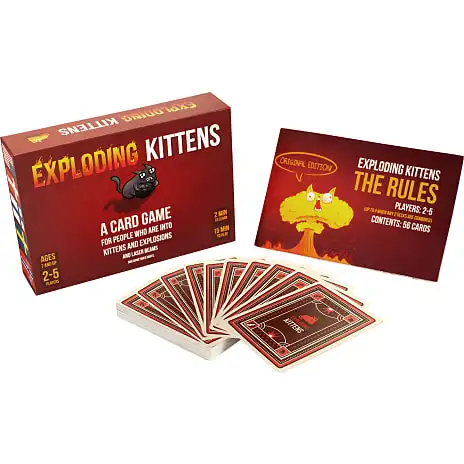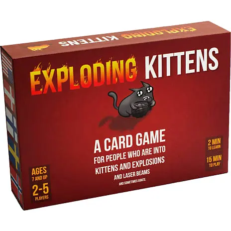 Kast jer ud i denne eksplosive, kattekillingespækkede udgave af Russisk Roulette, der hverken indeholder noget russisk eller kattekillinger. I din tur skal du spille et kort og herefter trække et nyt. Hvis du trækker en exploding kitten, er du ude af spillet. Der er dog mange kort og handlinger, der kan forhindre dette. Exploding Kittens fjollet og sjovt, og det er perfekt til en spilaften med vennerne.