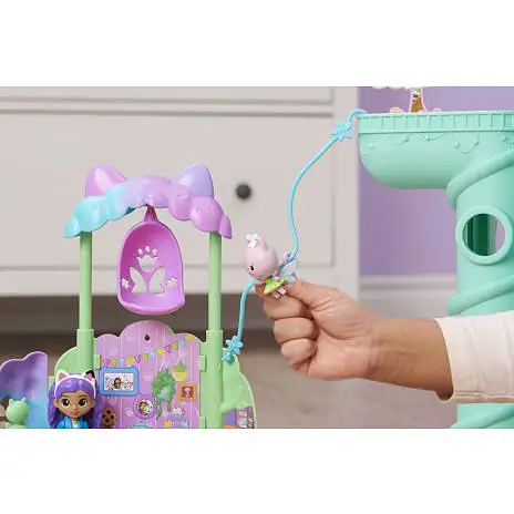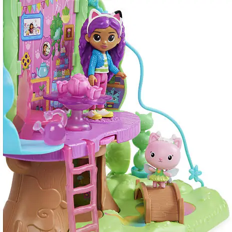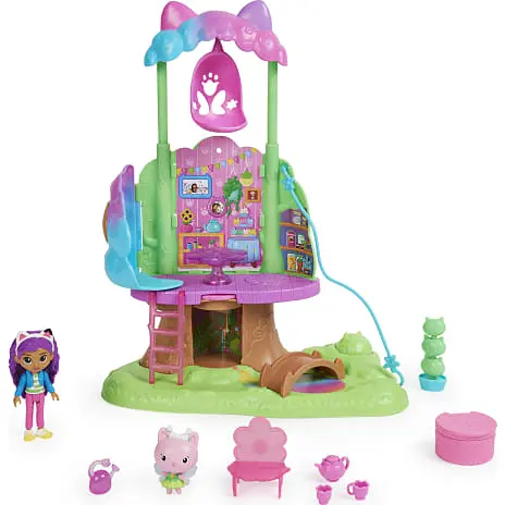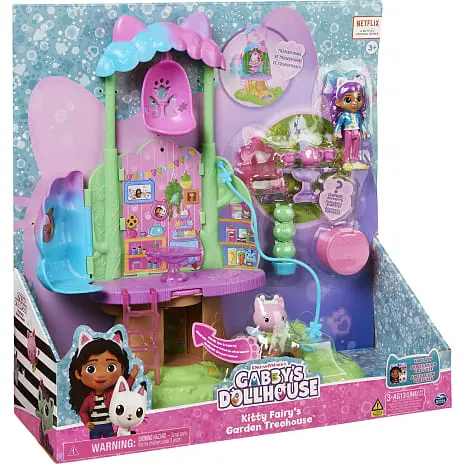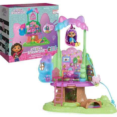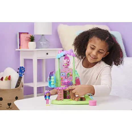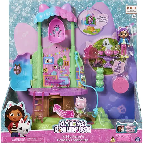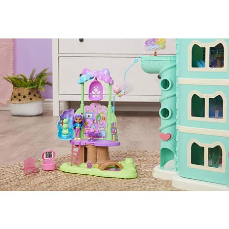 Væk din helt egen dukkehusverden til live med Gabbys Dukkehus Alfekats Træhus i Haven-legesættet. Dette dejlige børnetræhus er inspireret af det fortryllede candyfloss-træ fra serien og har lys, et forvandlende trækronetag, hemmeligt rum, zipline, gynge, figurer, tilbehør og møbler til at udleve dine eventyr. Udforsk træhusets to etager med Alfekat og en eksklusiv ca 9 cm høj Gabby-figur. Oplev en trækrone, der åbner sig og afslører et legeområde. Når du har udforsket alle de vidunderlige funktioner, kan du pakke din særlige Dukkehus Levering ud, ligesom Gabby gør i serien, og finde en overraskelses-vandkande, som et tilbehør, du kan bruge i din leg. Når du har pakket Dukkehus Leveringen ud, kan du putte alle de dejlige møbler og tilbehørsdele med eventyr-tema ind i træhuset, inklusiv en gyngende kronbladsstol, en stige, så man kan komme til anden sal, en stol og spisebord til teselskaber i haven, en katte-planteskulptur, som du kan dreje rundt og meget mere. Der er også indbygget et tommelfingerhjul i gulvet – drej det for at finde et hemmeligt rum i træstammen og se, hvordan stammen og bordet lyser op (batterier inkluderet). Skub Alfekat ned af ziplinen fra øverste etage til stueetagen, og hægt ziplinen på ydersiden af Gabby’s Kat-tastiske Dukkehus (sælges separat). Hvis du vil have en en sidste overraskelse, kan du scanne QR-koden inde i Dukkehus Leveringen for at låse en særlig reward i den gratis Gabby’s Dollhouse-app op (tilgængelig på iOS og Android). Når du har haft en sjov dag med masser af leg, kan du lukke trækronen og gemme alle dine vidunderlige skatte indeni. Dette træhus er den ultimative gave til børn på 3 år og derover. Oplev magien ved Gabbys Dukkehus med Gabbys DH Alfekats Træhus i Haven-legesættet.