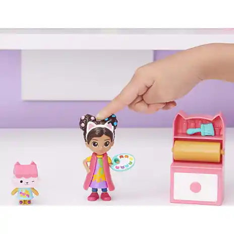 Placer paletten eller overraskelsestilbehøret i Gabbys hånd, og hjælp hende med at blive kreativ i værkstedet. Tryk ned på Gabbys katteører og se, hvordan hendes forklæde forvandles fra rent til fuldt af malepletter. Tryk på katteørerne igen for at gøre forklædet rent. Det er så sjovt. Leg derefter, at du tager noget kreapapir fra skabets rulle – det drejer rigtigt.