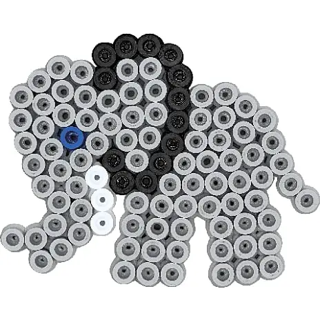 Bøtten indeholder ca. 600 maxi perler ass. farver, 2 gennemsigtige stiftplader: løve nr. 8229 og lille elefant nr. 8230. Motivark, vejledning og strygepapir.