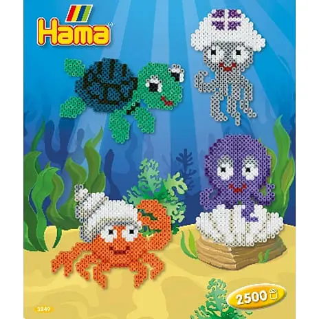 Ca. 2.500 perler, 1 stor firkantet stiftplade nr. 234, motivark, vejledning og strygepapir. Perlerne kan laves til havdyr.