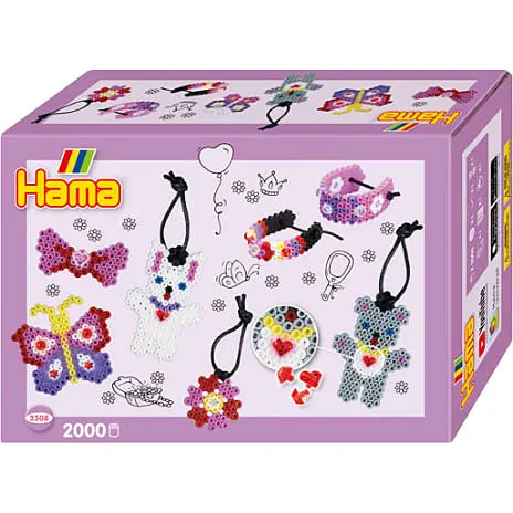 Æsken indeholder Ca. 2.000 perler, 1 medium sekskantet stiftplade nr. 329, 2 Hama Gems, 1 vokset bomuldssnor, motivark, vejledning og strygepapir.
