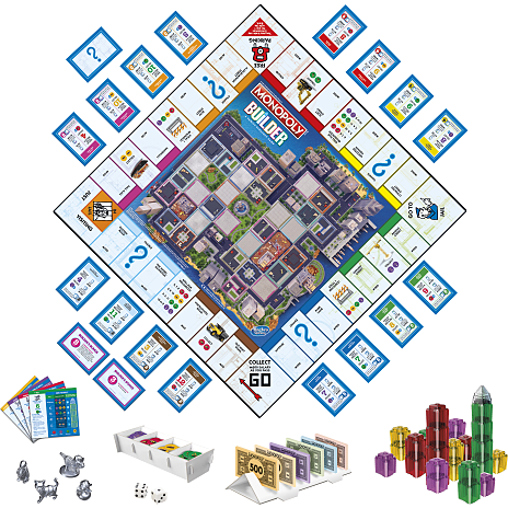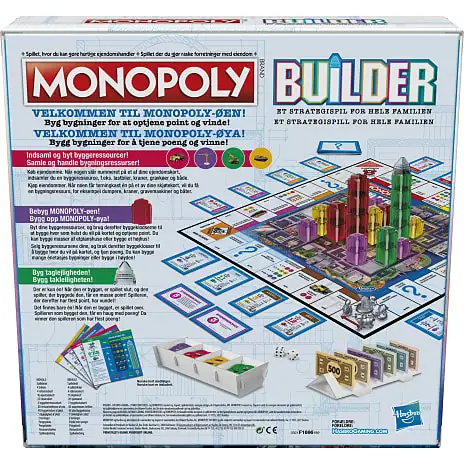 Det er det kendte Monopoly-spil, men med en strategisk drejning på Monopoly Island, der ligger midt på brættet. I Monopoly Builder-strategispillet skal spillerne flytte rundt på brættet og købe ejendomme og indsamle husleje og ressourcer. De bruger også byggeklodser til at bygge deres by på øen! Jo mere spillerne bygger, jo flere point optjener de. Spillet slutter, når taglejligheden er bygget. Så vinder den spiller, der har flest point! Dette familiebrætspil er beregnet til 2-4 spillere fra 8 år – det er supersjovt at spille. Hasbro Gaming-, Parker Brothers- og Monopoly-navnet og -logoet, spillebrættets særegne design, de 4 hjørnefelter, Mr. Monopoly-navnet og -figuren samt de særegne elementer på spillebrættet og spillebrikkerne er varemærker, der tilhører Hasbro for dets ejendomshandlende spil og spiludstyr.