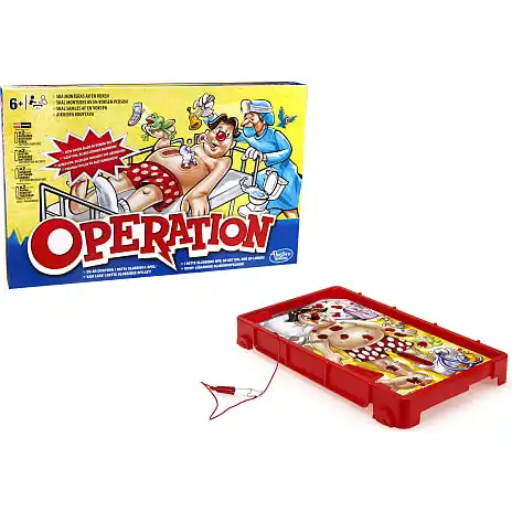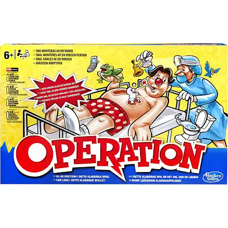 Operation er nu blevet endnu mere udfordrende i denne udgave af det klassiske spil med dybere og smallere åbninger. I skiftes til at fjerne dårligdomme fra patienten, men pas på SUMMETONEN! Den læge, der har den roligste hånd, VINDER spillet! Bruger 2 x AA batterier (ekskl.). Måler B: 40 x H: 25,1 cm. Fra 6 år.
