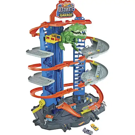 Nyhed i 2020: Det er den ULTIMATIVE udfordring med den HØJESTE Ultimate Garage nogensinde, med uendelige muligheder for leg og masser af action. Det enorme legesæt har parkeringspladser til mere end 100 køretøjer og en hemmelig robot-T-rex, der sætter gang i børnenes fantasi. Børnene kan selv køre bilerne helt op til toppen i elevatoren, der har plads til to biler. De kan ræse ned gennem garagen, der er i flere etager, og eksperimentere med de mange forskellige legefunktioner, der gør legen ny og spændende hver gang. Kan sættes sammen med andre Hot Wheels®-sæt (sælges separat) og indeholder 2 Hot Wheels®-køretøjer i størrelsesforholdet 1:64 samt mulighed for leg med Hot Wheels™-id. Klik Hot Wheels™ id Portal (sælges separat) fast for at få adgang til endnu mere leg: Scan en bil, ræs mod modstanderne, flygt fra robot-T-rexen og vind løbet.