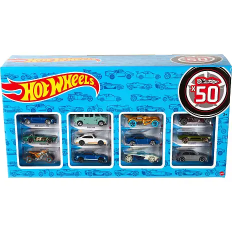 Hot Wheels®-biler er til glæde for både børn og bilelskere med deres fede stil, rullende hjul og seje dekorationer. Denne pakke med 50 biler skaber en hel samling på én gang for dem, der lige er begyndt deres rejse i Hot Wheels®-universet, eller for dem, der vil udvide deres eksisterende samling. Hot Wheels® lægger op til uafhængig opdagelse og inspirerer børn til at omfavne kreativ historiefortælling og eventyr. Denne multipakke kommer med sin egen Hot Wheels®-boks, hvor de medfølgende køretøjer kan udstilles. Sættene sælges hver for sig, så længe lager haves. Farver og mønstre kan variere.