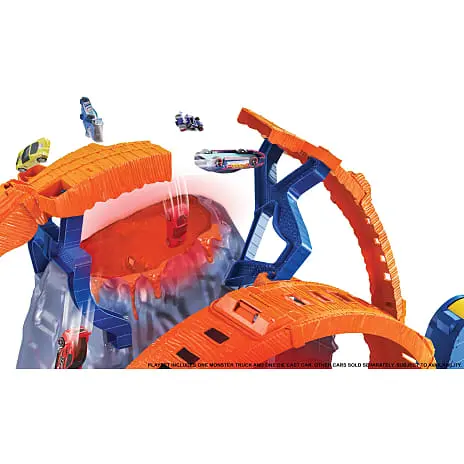• Det gigantiske Hot Wheels®-monstertrucks T-Rex-vulkanarenasæt vækkes til live med lys, lyde, store loops, en dinosaurfjende, der dukker op af den “”levende”” vulkan, og masser af action.
