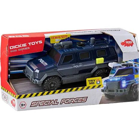 Politibilen er udstyret med lys og lyd, og kan også sprøjte med vand fra den lille kanon, der er placeret på toppen af bilen.