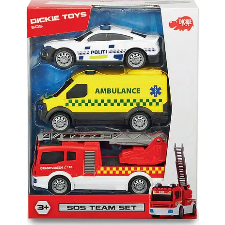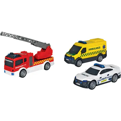 I dette sæt får dit barn 3 SOS biler bestående af en politibil, ambulance og en brandbil. Bilerne er udstyret med free-wheel hjul, og kan køre frem og tilbage. Stigen på brandbilen er bevægelig og trækkes ud og ind.
