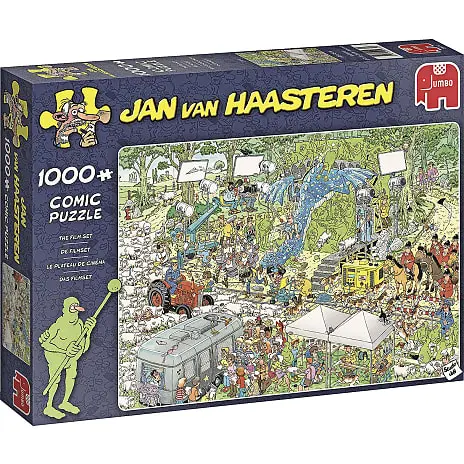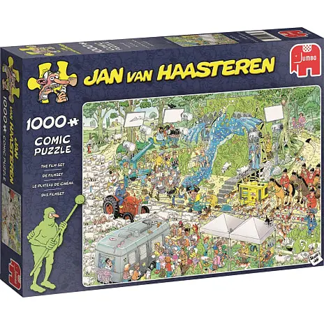 Jan Van Haasteren er kendt for sine detaljerede, farverige og humoristiske puslespil. Hver gang du laver et, vil du finde nye detaljer og karakterer, dog vil hajfinne altid være at finde. Kan du finde den? Der sker ting og sager på filmsettet. 1000 brikker. Str. 68×49 cm.