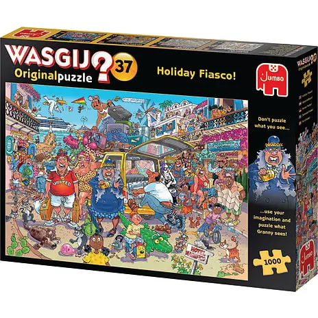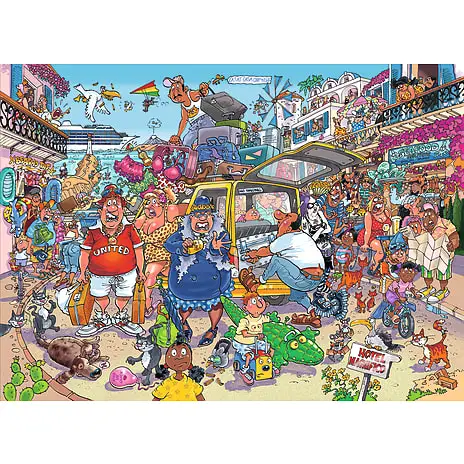 Ikke alt går som planlagt på denne ferie. I dette Wasgij puslespil skal du ikke lægge det motiv, der er på æskens forside, men i stedet det, som personerne har fået øje på.