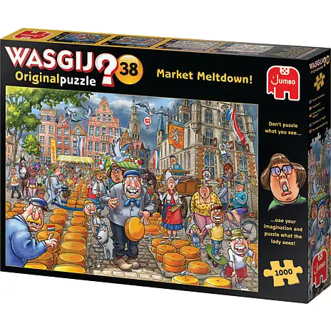 På markedspladsen har ostehandleren lagt en lang række oste frem. I dette Wasgij puslespil skal du ikke lægge det motiv, der er på æskens forside, men i stedet det folkene har fået øje på.