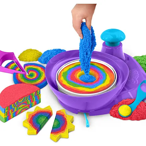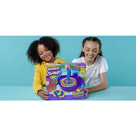 Nu kan du hvirvle sand og på magisk vis skabe smuk sandkunst med Swirl N’ Surprise-legesættet. Sættet giver mulighed for at lade børn bruge hænderne og skabe ægte Kinetic Sand-kunst, da de får mulighed lade sandet flyde mellem fingrene, hvirvle det og stable det med de 4 redskaber og 907 g rød, lilla, grøn og gul sand. Gør sandet luftigt og fyld hvirvle-maskinen, luk låget, så sandet ikke ryger ud, og tryk derefter ned på pumpen for at hvirvle sandet rundt. Betragt nu, hvordan du skaber fascinerende sandkunst. Hvirvl og skær i skiver igen og igen – det er så sjovt. Med Kinetic Sand Swirl N’ Surprise-legesættet er der så mange kreative muligheder. Hvis du vil lege endnu flere sandlege, kan du kigge efter 907 g Kinetic Sand poser med farvet sand og SANDisfactory-sættet (sælges separat). Kinetic Sand er det originale magiske, formbare og fascinerende legesand. I modsætning til fx modellervoks tørrer dette sensoriske sand aldrig ud, så du kan lege selvstændigt med Kinetic Sand i timevis, mens følesansen trænes. Lad det flyde gennem dine fingre – det er så tilfredsstillende, at du ikke kan lægge det fra dig igen. Kinetic Sand er lavet med naturligt sand og er ikke giftigt og allergivenligt. Det klæber på magisk vis sammen og er nemt at rydde op. Kinetic Sand er den perfekte gave til børn. Lav dine helt egne overraskende effekter med Kinetic Sand Swirl N’ Surprise Set.