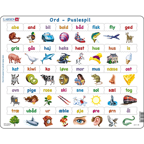 Dette puslespil illustrerer en masse forskellige ord i alfabetisk rækkefølge, med motiver der matcher hvert ord. Det kan hjælpe børn med at komme ordentligt i gang med at læse, på en legende måde.