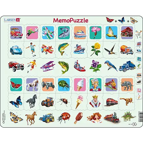 Dette puslespil illustrerer forskellige motiver, som kan hjælpe børn med at styrke sin hukommelse, på en legende måde. Puslespillet kan bruges som et huskespil, hvor dit barn kan finde de matchende brikker til motiverne.