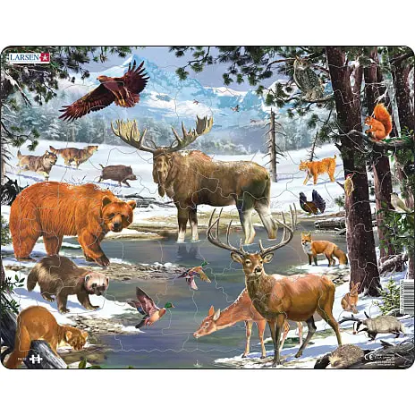 Dette puslespil illustrerer et billede af en masse forskellige dyr, der lever i skovene i det nordlige Amerika og Canada. Kender dit barn mon alle dyrene?