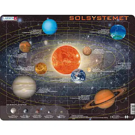 Dette puslespil illustrerer et billede af vores solsystem, som kan hjælpe børn med at få et indblik i de forskellige planeter. Derudover er puslespillet udstyret med information til hver planet.