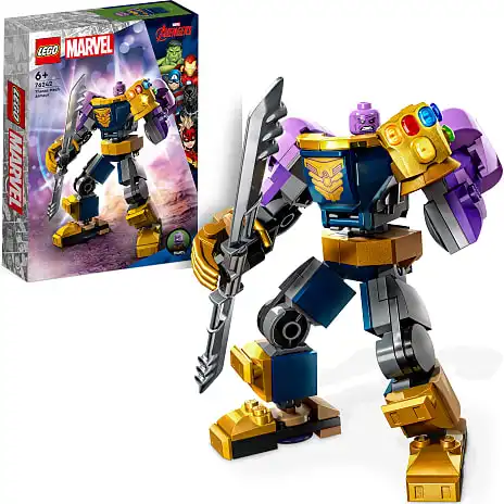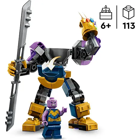 LEGO minifiguren af Thanos passer fint ind i mech-robottens cockpit, der kan åbnes. De fuldt bevægelige arme, ben og fingre gør, at den kan placeres i positurer til masser af fantasifulde lege- og udstillingsmuligheder. Karakterens berømte dobbeltsidede sværd, Evighedshandsken og Evighedsstenene medfølger også for at sikre, at eventyrene aldrig slutter.