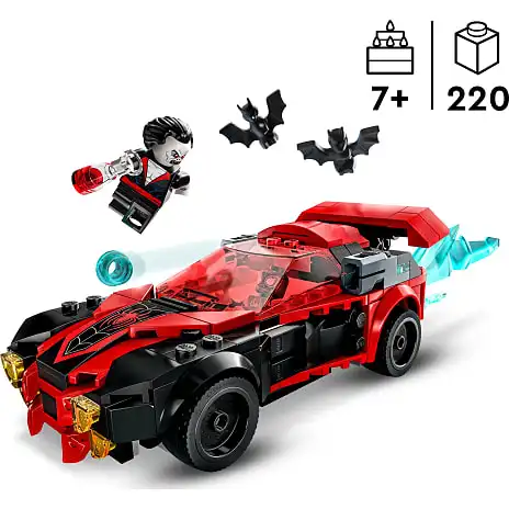 Marvel-fans vil elske dette toptunede sæt med minifigurer af Miles Morales og vampyrskurken Morbius samt et væld af autentisk tilbehør og en superracerbil. Bilen har to knopskydere foran og et stort boosterelement bagpå, når der er behov for ekstra kraft. Der er også et stort netelement, som Miles Morales kan “slynge”, og et par flagermus, der hjælper Morbius med hans ondsindede planer.