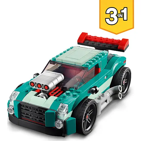 Børn får 3 forskellige bygge- og legeoplevelser med dette LEGO Creator 3-i-1-legesæt. De kan bygge muskelbilen Gaderacerbil, ombygge den til en racerbil, en specialbygget rød og blågrøn hotrod-model eller fyre op under fantasien og skabe en anden kraftfuld og hurtig bil.