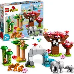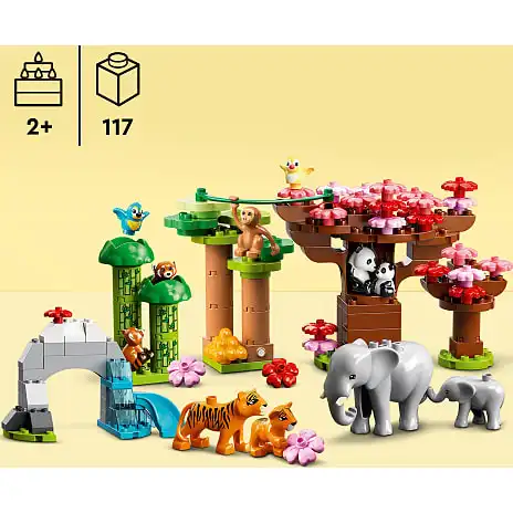 Ethvert barn med interesse for dyr vil blive betaget af de uendelige legemuligheder, den asiatiske dyreverden rummer. Det er hjemsted for en voksen elefant med unge, pandaer og tigre, en abe, 2 fugle og 2 røde pandaer samt bambus og et kirsebærtræ og en udfoldelig, tredimensionel legemåtte. Der er oven i købet en lydklods, som afspiller realistiske jungle- og dyrelyde.