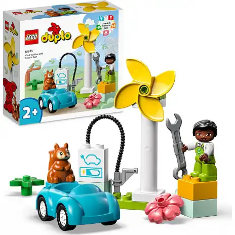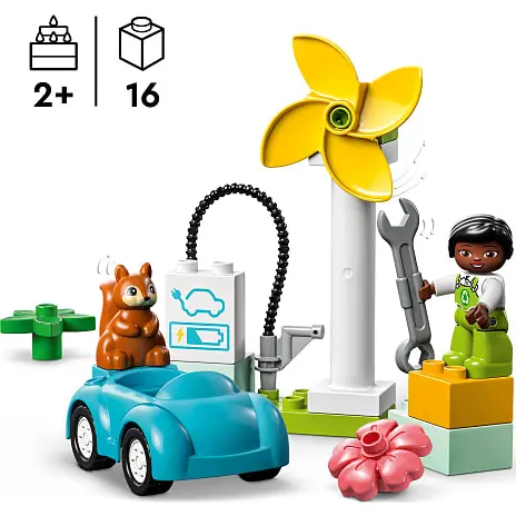 Der er masser af aktivitet, som kan stimulere små børn fra 2 år. De kan dreje vingerne for at generere elektricitet og derefter koble bilen til ladestanderen. De vil elske at lege, at de er teknikeren, der reparerer bilen eller møllen. Det søde egern kan give hende skruenøglen, hvis hun har brug for lidt hjælp.