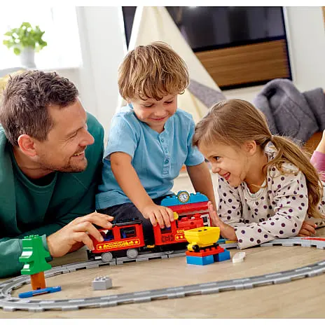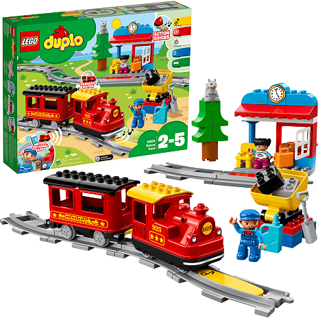 LEGO® DUPLO® 10874 Damptog er nu endnu nemmere for dit barn at styre og lege med på flere forskellige måder. Små børn kan blive lokomotivførere med skub-og-kør-motoren -; et blidt skub enten frem eller tilbage sender toget på vej, og hvis det holdes fast eller løftes af skinnerne, stopper det. Hjælp barnet med at placere de 5 farvede handlingsklodser langs sporet for at tude i hornet, tænde og slukke for lysene, holde pause og tanke op, skifte retning og standse toget, hvor det passer bedst. Med togstation, tippelad med kul, 2 DUPLO figurer, dyrefigur og et simpelt sæt togskinner i dette LEGO DUPLO sæt kan små børn nyde klassisk og sjov leg med tog. Download appen for at få endnu flere legemuligheder, bl.a. fjernbetjening og sjove aktiviteter, du kan gennemføre med dit barn!