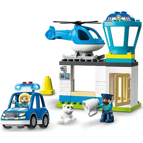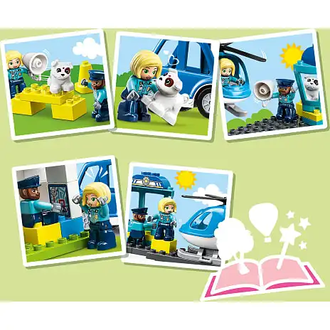 Politistationen er fuld af sjove aktiviteter. Der er en skub-og-kør-politibil med blinkende lys og sirene (batterier medfølger), en sød hund at træne, og et vagttårn, hvorfra betjentene kan holde øje med politihelikopteren, der har drejelige rotorblade. Når børn bygger og leger, udvikler de deres finmotorik, følelsesmæssige bevidsthed og meget mere. Og fordi de altid selv har handlingen mellem hænderne, er det en måde for små børn at lære om politiarbejde på uden bekymringer.