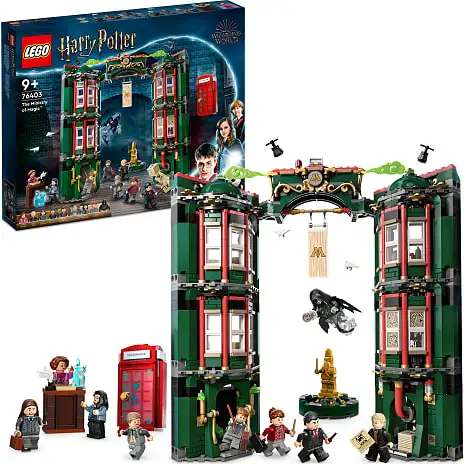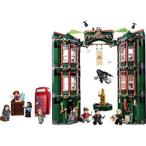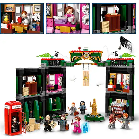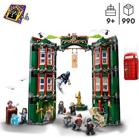 Dette sæt i flere etager gengiver den fulde størrelse og omfanget af aktiviteter i Ministeriet for Magi. Blandt de velkendte figurer er Harry Potter, Hermione Granger™ og Ron Weasley™, der – ved at dreje hovedet og tilføje et nyt hårelement – på magisk vis forvandler sig til Albert Runcorn, Mafalda Hopkirk og Reg Cattermole. Bag facaden kan flere detaljerede rum udforskes: Dolora Nidkjærs kontor, Arthur Weasley kontor, Profetisalen og retssalen. Børn skal finde Slytherin™-medaljonen og flygte uden at blive fanget af Yaxley, Pius og dementoren! Med den gratis app LEGO Byggevejledninger kan børn zoome ind på og dreje modellen, mens de bygger, og det modulopbyggede design gør det nemt at bygge ministeriet om til endeløse nye eventyr.