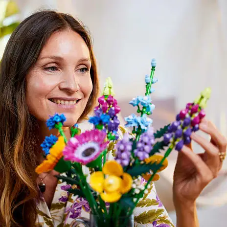 Buketten er lavet udelukkende af komplekse LEGO elementer og indeholder 8 arter af vilde blomster på justerbare stængler. Spirende blomsterhandlere og blomsterelskere kan bruge timevis på at bygge og identificere blomsterne, der er inspireret af kornblomst, lavendel, skovvalmue, vild kørvel, læderløv, gerbera, ridderspore og lupin. Når LEGO blomsterne er færdige, kan de udstilles i en yndlingsvase og blive en iøjnefaldende del af boligindretningen, som vil få glæden til at spire, uanset hvilket rum de placeres i.