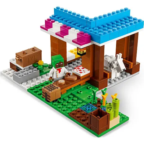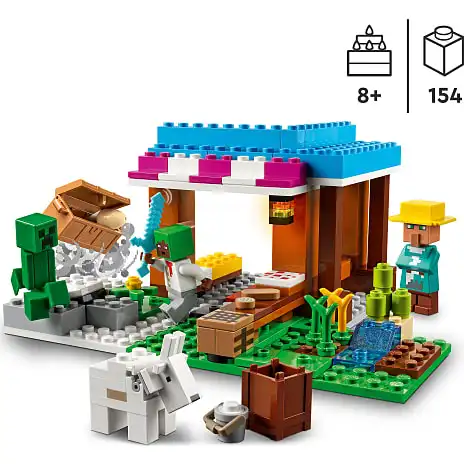 Dette aktivitetsfyldte Minecraft-legesæt indeholder masser af legemuligheder. Minecraft-karaktererne omfatter en bager, sne-landsbyboer, ged og en Creeper™. Det travle bageri har et møbleret rum, hvor børn kan udspille historier om livet derhjemme. Før brødet og småkagerne kan bages, skal børn have fat ingredienserne. De får hvede ved at hjælpe en landmand med at dyrke det. De får mælk ved at malke geden. Til slut kan de være kreative i køkkenet sammen med bageren. For at øge spændingen lurer en af de frygtede Creepere i nærheden, og den er fast besluttet på at ødelægge kisten med et værdifuldt æg indeni. Børn skal forsvare bageriet med det klassiske Minecraft-våben – et diamantsværd. Når kampen er ovre, er det nemt at omarrangere det modulopbyggede sæt, så det kan inspirere til endeløse nye eventyr.