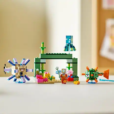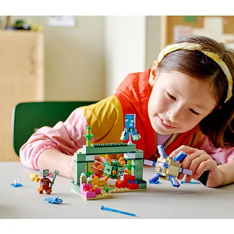 Børn kan påtage sig en actionfyldt udfordring i denne medrivende Minecraft-mission, der foregår under havet. Først skal de bygge et monument midt i det farverige koralrev. Der er skjulte skatte at finde, men også 2 ikoniske Minecraft-mobs: en vogter og en ældstevogter, der er fast besluttede på at stoppe dem. Bevæbnet med en trefork og med hjælp fra 3 tamme axolotler skal børn kæmpe mod de fjendtlige mobs for at fortsætte deres mission. Der er yderligere fare fra en fjederbetjent skyder, som affyrer et lasermissil med et svirp fra ældstevogterens hale. Dette LEGO klodseventyr rummer uendelige kreative legemuligheder og giver dermed børn spændingen ved Minecraft-spillet mellem hænderne.