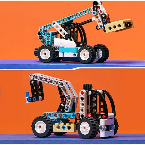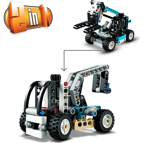 Der er masser, som kan holde børn beskæftiget med dette cool byggesæt, eftersom den seje model af en teleskoplæsser kan ombygges til en kranvogn med styring og en kranarm, der kan løftes.