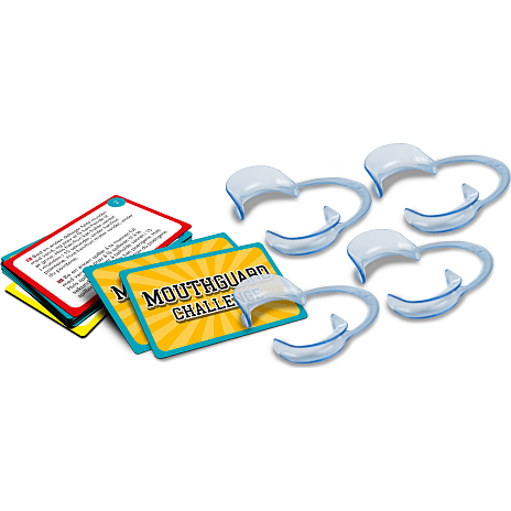 Konkurrer med dine venner og familie, mens i forsøger at holde masken i dette hysterisk morsomme spil! Spillet hvor det betaler sig at have en stor mund! Mouthguard Challenge indeholder 4 mundstykker og 55 opgave kort .