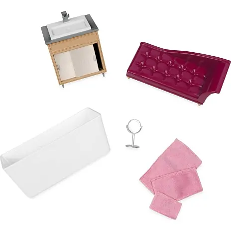 Indeholder: dette legesæt kommer med et moderne badekar, loungestol, vask, spejl, stort håndklæde, medium håndklæde og en ansigtsklud. (Dukker og dukkehus sælges separat.)