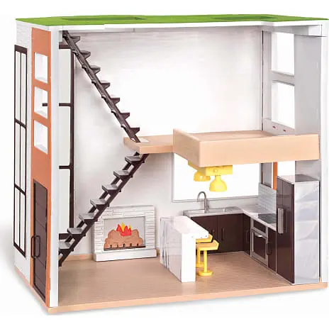 Med én helt åben side og en hoveddør kan børn nyde legeområder både inde og ude. Saml alle de stilfulde Lori dukkehusmøbelsæt for at designe dit loft, lige som du vil have det!