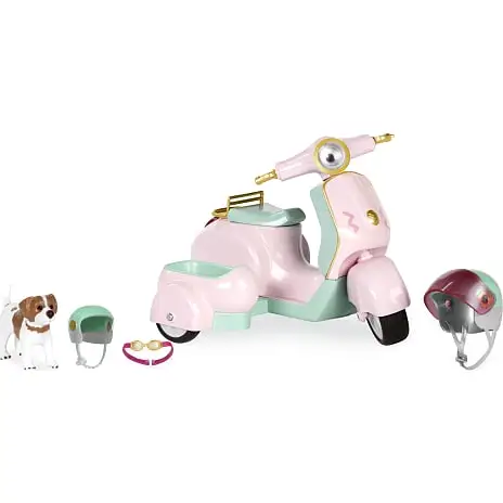 Udforsk byen med Lori Scooter! Legesættet inkluderer et løbehjul, polstret sæde, Jack Russell Terrier-hvalp, 2 hjelme og hundebriller.