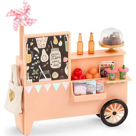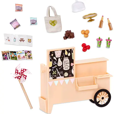 Indeholder: en rullende snackvogn, vindmølle, appelsiner, æbler, brownies, stativ med klokkeglas, juice, snacks, drinks, ugeblade magasiner og en mulepose. (Dukker sælges separat.)