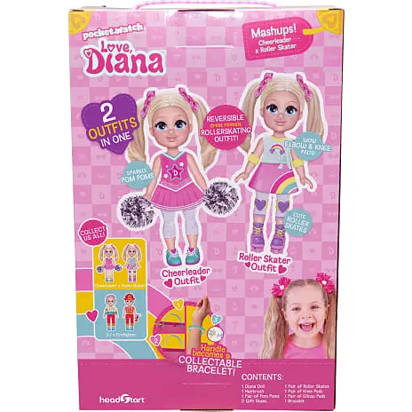 Se lige her! Diana skifter fra at være en glad cheerleader til en sej tøs på rulleskøjter! Diana er iklædt sit cheerleader outfit med pomponer, og når du vender hendes kjole og giver hende rulleskøjterne, albue- og knæbeskytterne på, som ligger i æskerne – ja, så forvandler du hende til en rulleskøjteløber. Fra 3 år.
