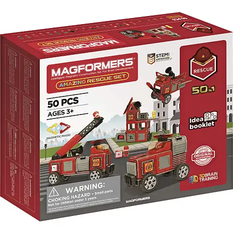 Magformers rednings sæt med 50 dele og en bruchure til at bygge efter. Gør det muligt at bygge 50 forskellige konstruktioner.