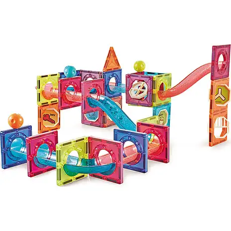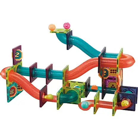 Du kan bygge fantastiske farverige bygningsværker og det er kun fantasien, der sætter grænser for dine værker! Til de medfølgende kugler kan der bygges stejle og kringlede rutchebaner!