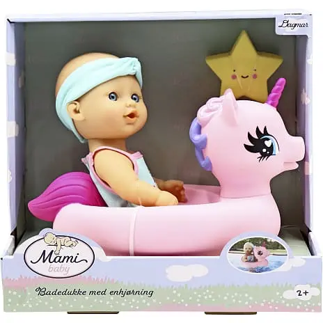 Mami Baby elsker at komme i bad. For så kan hun nemlig plaske rundt i vandet i sin søde enhjørningebadering. Hun har sin pinke badedragt med flæser på og er fuldt forsynet med alt det, hun har brug, når hun skal i bad. Legesættet opmuntrer små børn til rollespil og fantasifuld leg. Fra 24 mdr.