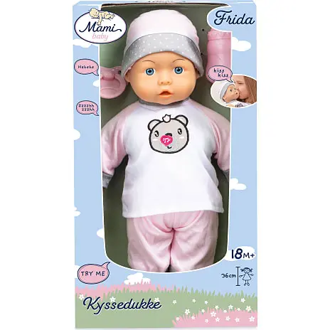 Dukken er en sød, blød kropsdukke med fantastiske funktioner. Hvis du rører blidt på Kiss Babys kinder, vil dukken sige en kys-lyd. Den søde babydukke pludrer, fniser, græder og griner som en rigtig baby. Lydene aktiveres ved at trykke på maven. Takket være sin bløde krop er dukken perfekt til at kæle og kramme. For at trøste og fodre dukken er en flaske og en sut inkluderet. Med sin dejlige bjørne-patch, den vidunderlige kombination bestående af pullover, bukser, matchende hue og på grund af sin størrelse er Kyssedukken den perfekte følgesvend til din næste fantastiske udflugt.